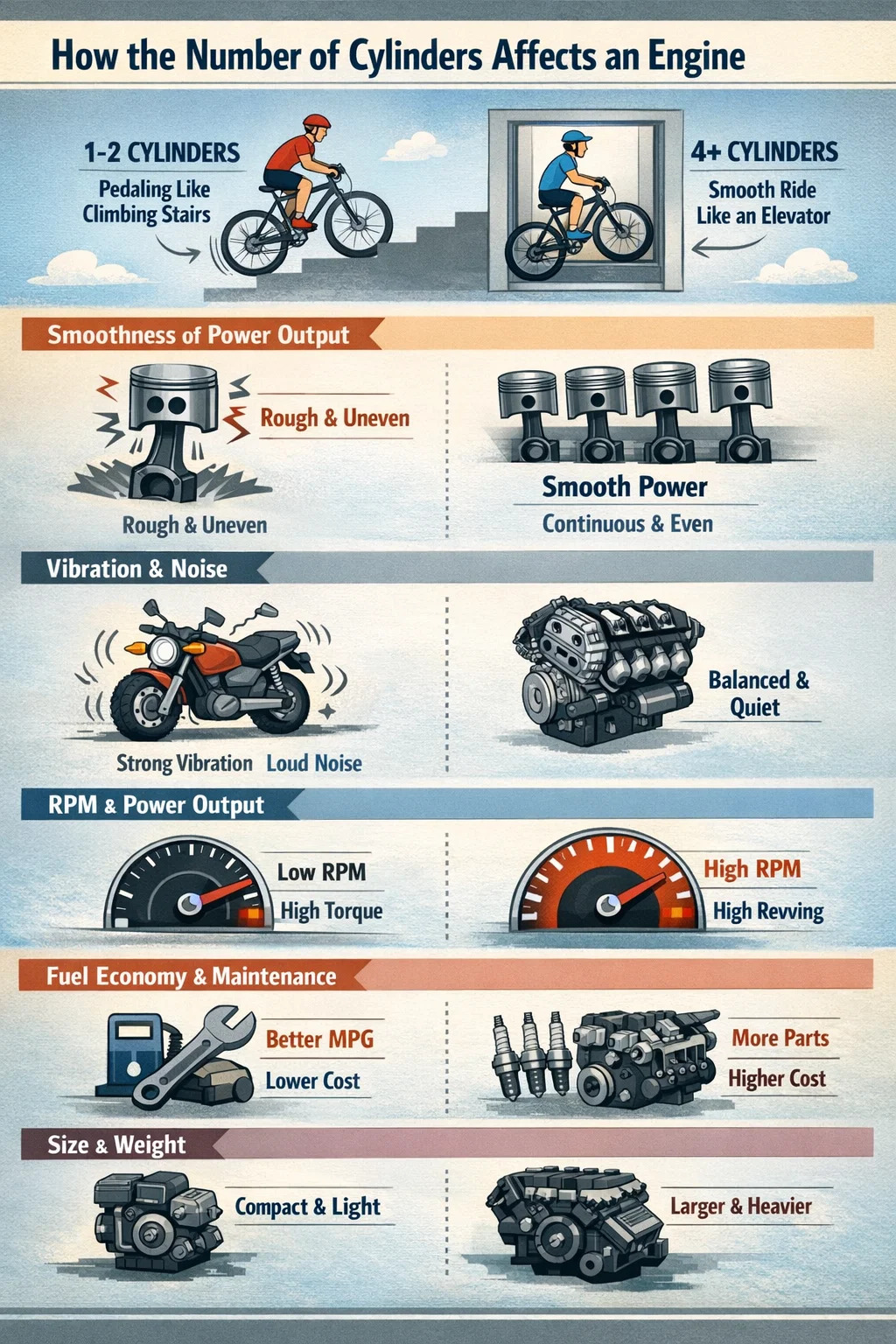 Уточнение: Двигатели с меньшим количеством цилиндров оказывают большее воздействие при каждом сгорании, а вибрация более прямая (именно поэтому некоторые большие одноцилиндровые двигатели). мотоциклы с цилиндрами может вызвать онемение рук после длительной езды). Чем больше цилиндров, тем меньше сила каждого сгорания, звук более чистый и тише на холостом ходу.