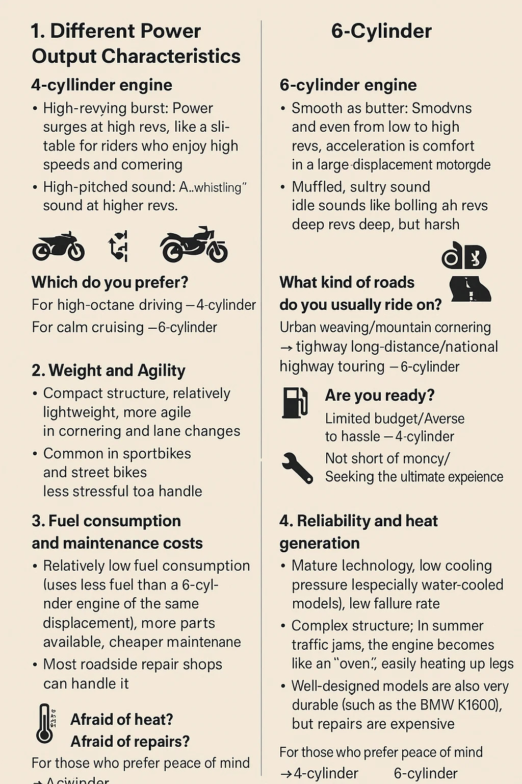 Выбор между 4-цилиндровым и 6-цилиндровым двигателем для вашего мотоцикла зависит от ваших предпочтений и стиля использования. Вот сравнение: