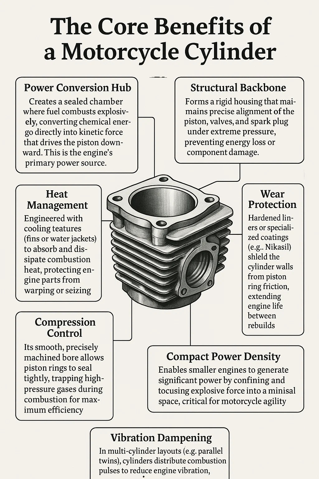 – Позволяет двигателям меньшего размера генерировать значительную мощность за счет ограничения и концентрации взрывной силы в минимальном пространстве, что имеет решающее значение для маневренности мотоцикла.