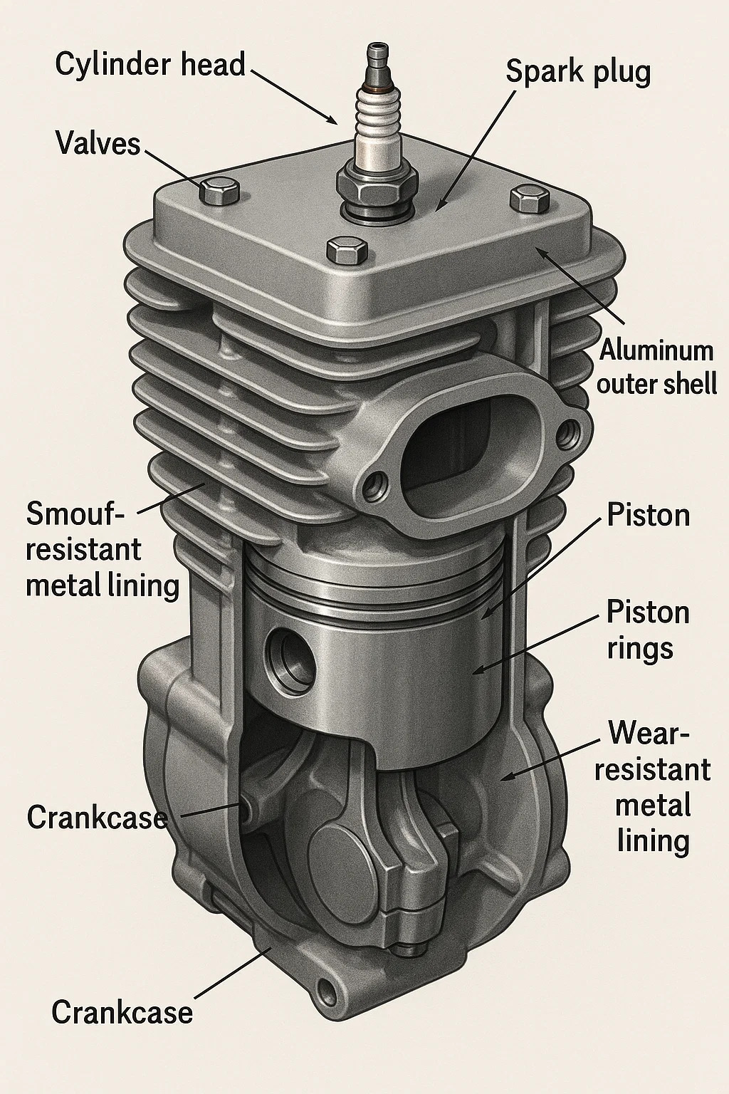Обычно имеет алюминиевую внешнюю оболочку (легкую, с быстрым рассеиванием тепла) с износостойкой металлической облицовкой внутри (например, никель-кремниевое покрытие или железную облицовку) для предотвращения износа поршня.